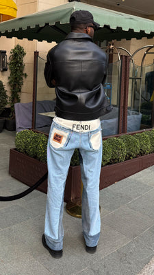Denim jeans crafted from reclaimed Levi’s denim and vintage Balenciaga dustbags.